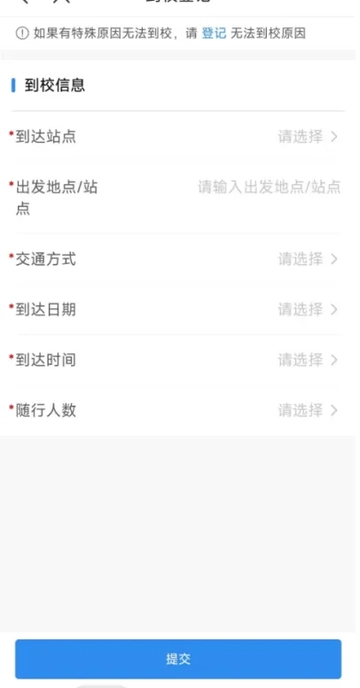 请点击进入到站登记应用,根据个人实际情况填写“随行人数、到站时间、到站地点及预计到校时间”等信息,完成后点击提交。若无法按时到校,请登记具体原因并提交申请,提交后请及时与负责老师联系确认。