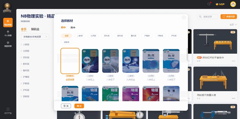 在左上角选定对应的学段,点击右上角的“新建资源”选项,再选择相应的模块,就能进入相关实验界面,这里以物理学科的电与磁模块为例。