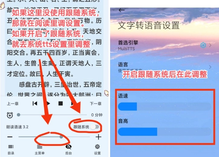 ①若在multi tts中启用了本地配置,系统将采用tts软件内部的声音设置,此时阅读时的听书效果与tts试音效果一致。