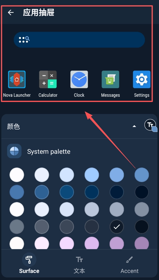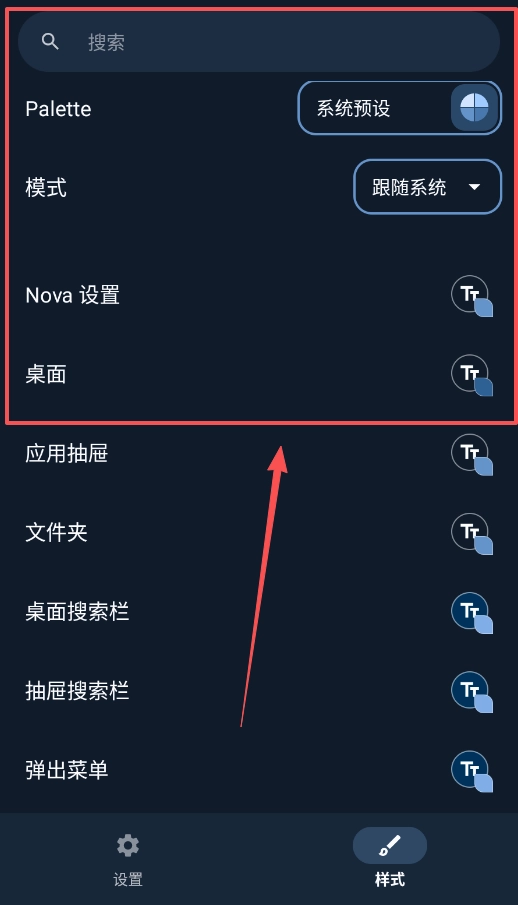Nova的搜索功能提供了丰富的视觉自定义选项,在“样式”菜单中,你可以借助“颜色选择器”对主题进行调整,可选择跟随系统、预设模式或手动设置。