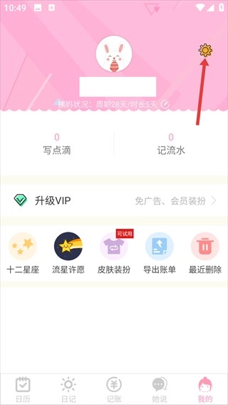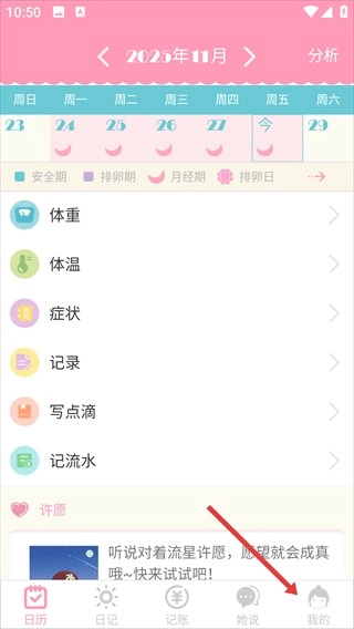 打开女生日历App,点击底部的【我的】选项,进入主界面。
