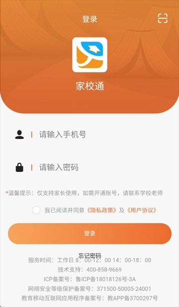 登录说明:登录账号是由学校提前预制到平台中的,通常情况下登录账号为学生监护人手机号码。
