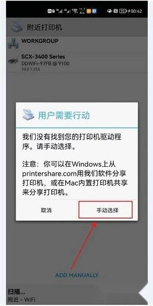 要是你没找到打印机驱动程序,那就点击“手动选择”。