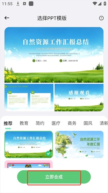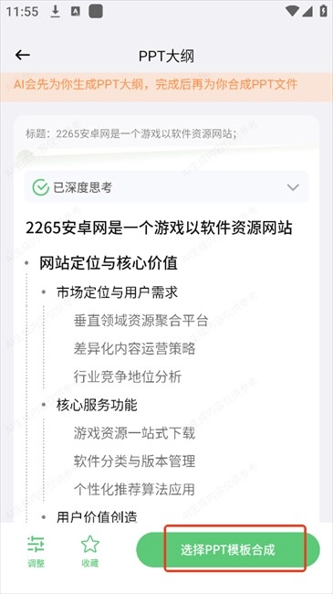 等待PPT大纲生成完毕并确认无误后,点击“选择PPT模板合成”按钮。