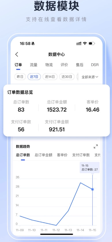 经营数据:实时掌握订单、流量、物流、评价等关键信息,制定针对性营销策略。