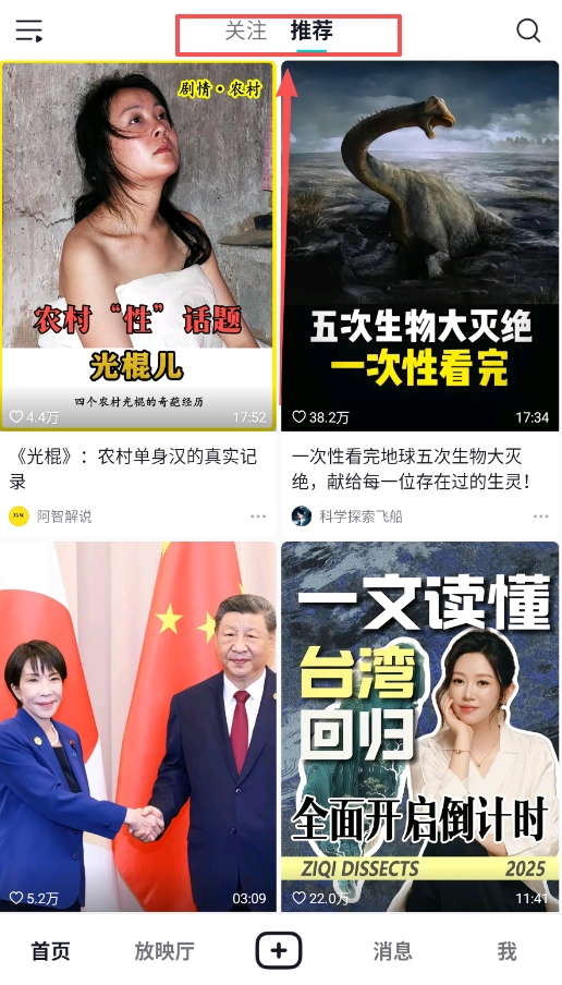 登录后进入首页的推荐板块,这里会呈现各类视频内容,涵盖农村生活记录、科学解说等不同类型。