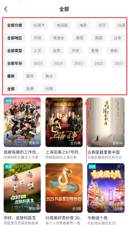 借助分类功能能够精准定位所需内容,进入全部分类页面后,可依据类型、地区、年份等不同条件进行筛选,丰富的筛选选项能助力你迅速找到心仪的内容。