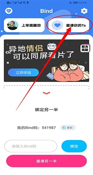 打开bind情侣定位软件,在首页点击上方的邀请按钮,接着在下方弹出的界面里输入bind码,这样就能完成绑定操作了。