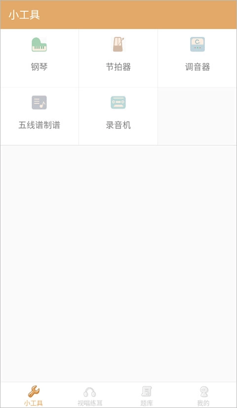打开练耳大师的工具界面后,能看到里面包含五个小工具,具体为钢琴、节拍器、调音器、五线谱制谱以及录音器。