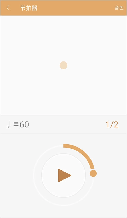 进入节拍器界面后,能看到醒目的播放图标,图标外围有一圈可调节的圆环。用户只需拖动圆环上的小球,就能调整节拍器的速度;速度设置完成后,点击播放按钮即可自动播放节拍。此外,右上角的音色选项还能让大家调整节拍器的声音,操作十分便捷。