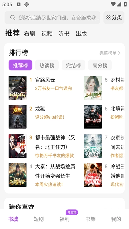 2、您可以在首页的“书城”板块查找,也能直接在搜索框输入小说名称搜索,还能借助分类导航或各类榜单来筛选心仪的书籍。