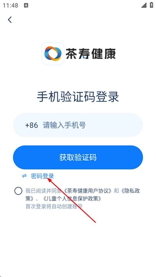 在手机验证登录页面点击密码登录选项,即可进入密码登录页面。