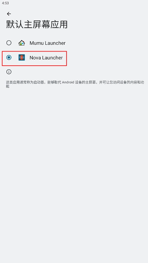 你只需在“默认主屏幕应用”的选项中选定“Nova Launcher”就可以了。