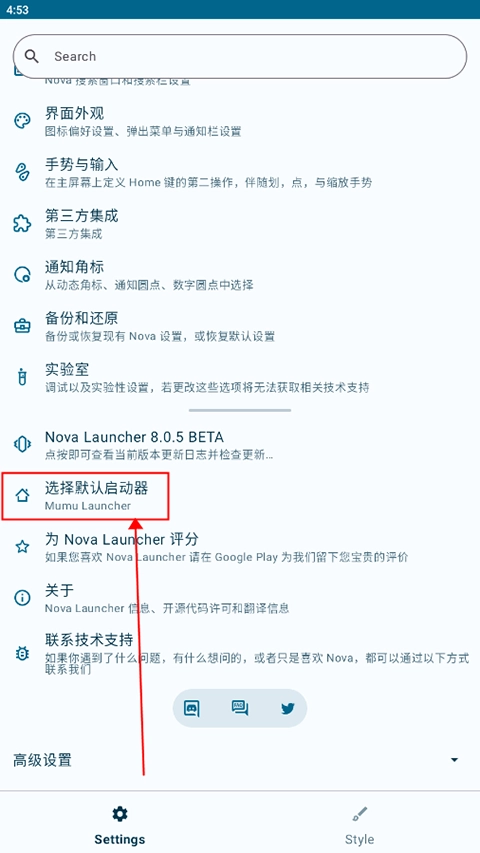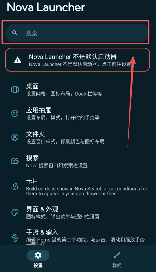 先处理默认启动器的问题,要是出现“Nova Launcher 不是默认启动器”的提示,直接点一下那条提示,系统会自动跳转到设置界面。