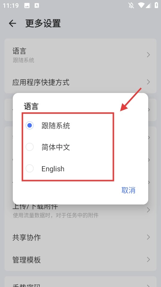 挑选目标语言(例如简体中文、English或者跟随系统),完成语言设置的更改。