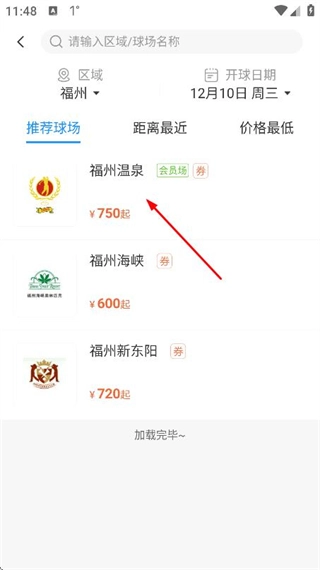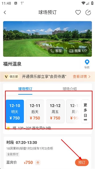 在球场预订页面选定日期后,点击预订按钮即可完成该球场的预订操作。