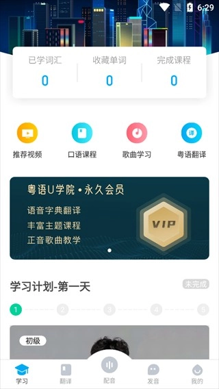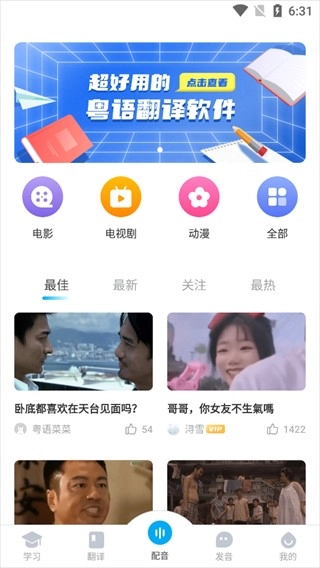 在学习板块,这里提供了推荐视频、口语课程、歌曲学习、粤语翻译等多种功能。