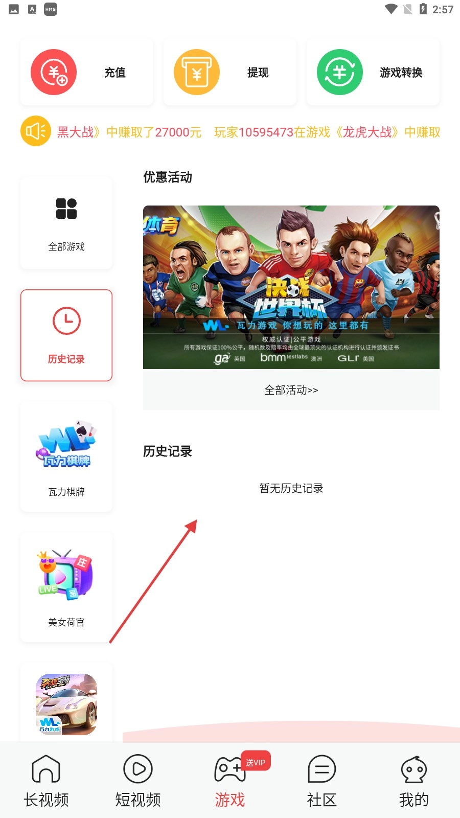 点击【历史记录】选项,就能查看游戏的历史记录;要是还没有玩过游戏,就会显示【暂无历史记录】。