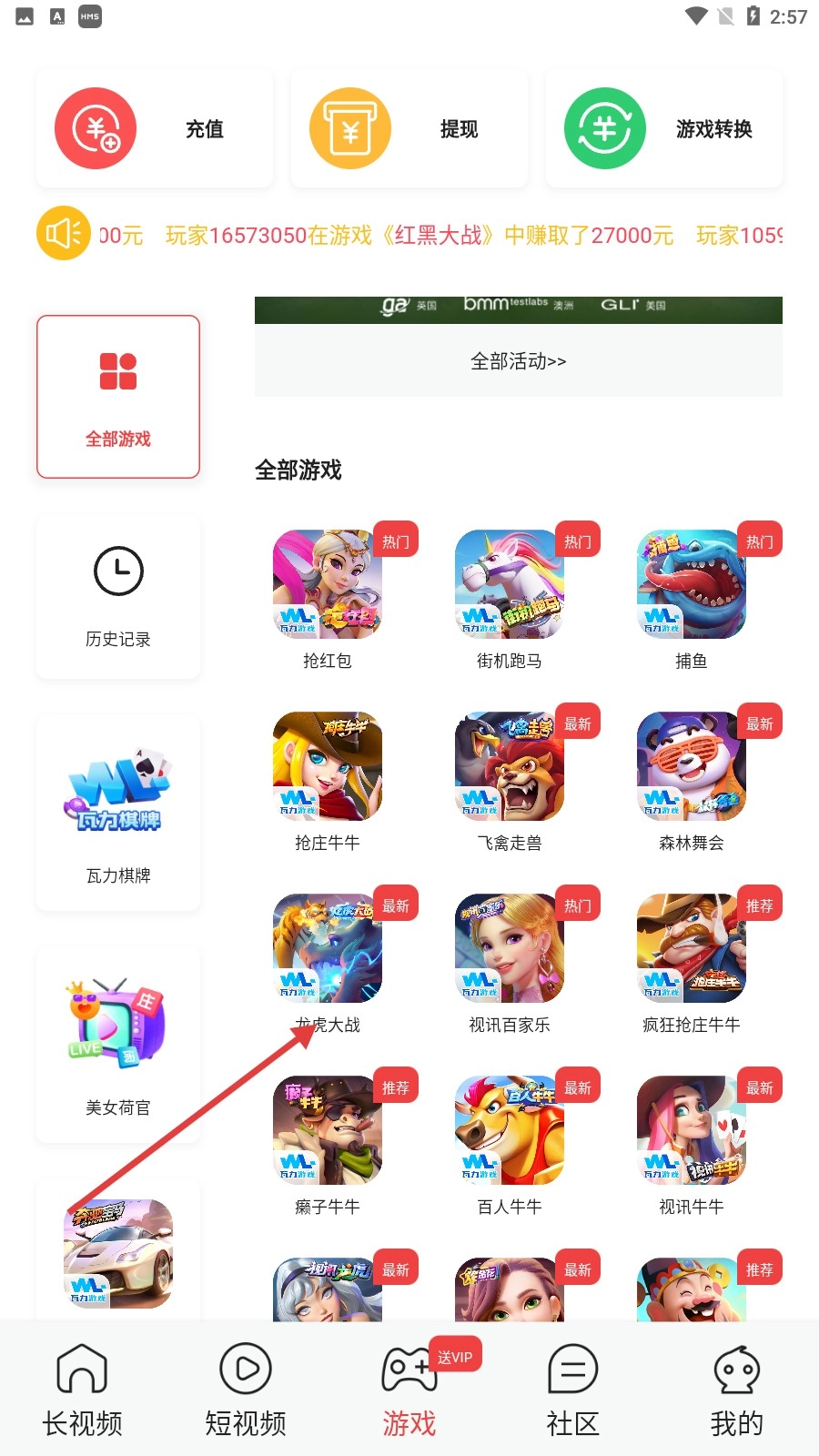 进入【游戏】页面后,你可以在【全部游戏】里选择像【龙虎大战】这类游戏,同时也能完成充值和提现的操作。