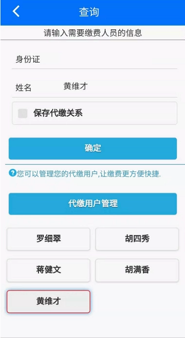 (1)用户可以代人进行缴费,点击【代人缴费】,在代人缴费页面输入被代缴用户的身份证和姓名,点击【确认】后进入缴费查询界面。