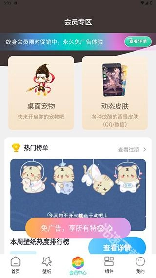 用户点击下方的会员中心入口就能进入会员中心页面,开通会员后可享有、会员专属壁纸等多项特权。