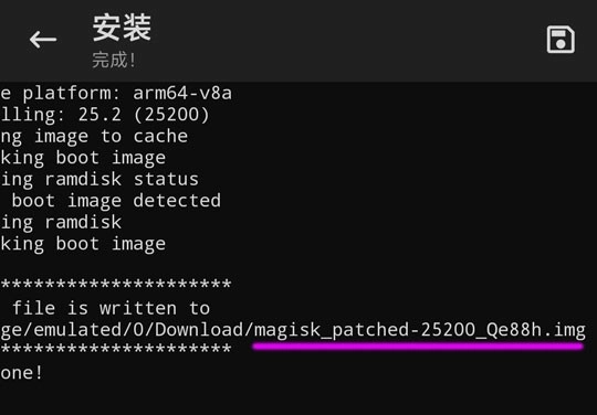 修补成功后,会在Download目录生成一个名为“magisk_patched-版本_随机字符.img”的文件,其中每次生成的随机字符各不相同,使用时请输入实际生成的文件名。