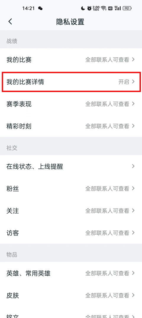 进入隐私设置界面后,在与战绩相关的模块里找到并选择“我的比赛详情”选项。