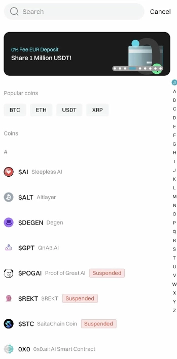 第3步:查看可支持充值的币种清单。点击意向币种,选定需充值的币种及其对应的网络。