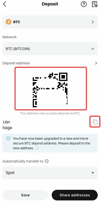 第5步:在选定您偏好的代币与网络后,我们会生成一组地址以及对应的二维码。您可任选其中一种方式来完成充值操作。