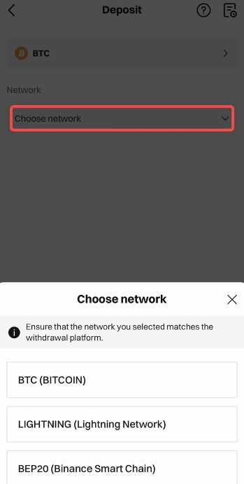 第4步:您所选的充值网络需和转出加密货币的平台保持一致(例如Bitcoin、Bitcoin Lightning、BEP-20、ERC-20等)。请务必仔细核对,一旦网络选择错误,有可能造成资产损失。