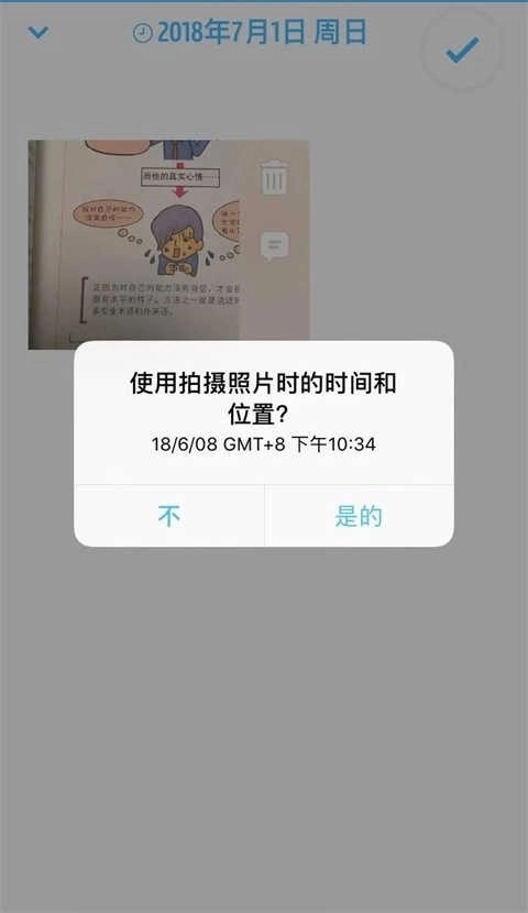 除此之外,照片还能按照拍摄当天的时间进行上传,具体可参考下图。这一设计充分考虑到用户可能在当天忘记记录的情况,同时也省去了用户专门去查看照片拍摄时间的麻烦。要是用户选择用过去的时间来写日记,App还会自动搜索当时的天气、本机记录的步数等相关数据,防止用户因记录延迟而缺失这部分信息,显得十分人性化。