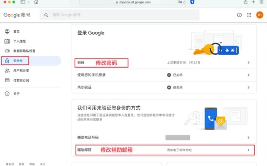 点击安全性选项,找到密码设置入口进行修改,随后把辅助邮箱更换为自己的邮箱。