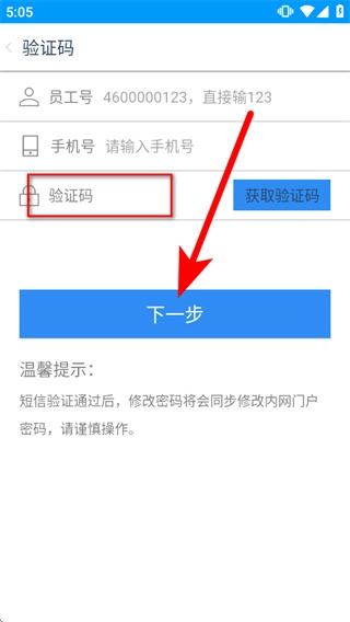 4、将收到的短信验证码填入验证码输入框,点击下一步,就可以重置密码了。
