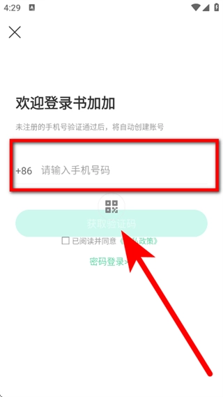 3、在登录页面,输入手机号码,点击获取验证码。