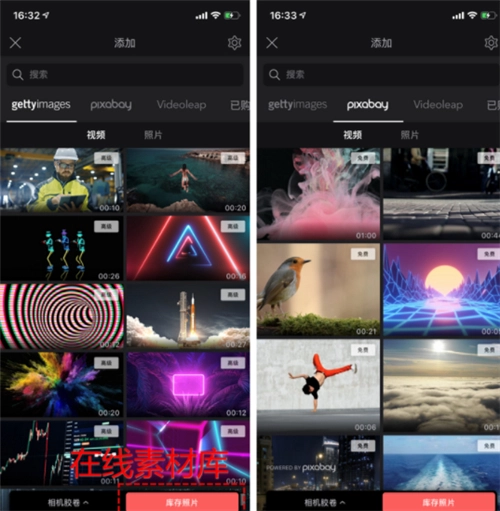 你也可以选用Videoleap在线素材库中的资源,这里面包含视频与照片;需要说明的是,gettyimages的素材得是*版才能使用,pixabay的素材则是免费的。