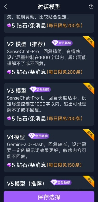 目前共有八个模型,依据回复长短设置了不同的限免次数,累计限免次数为1000次。模型回复较为灵活生动,但仍带有一些人机交互的痕迹;语音功能是免费的,不过需要进行引导操作。