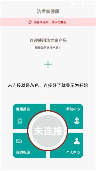 打开洁世家健康应用,点击“开始”图标;若第二步操作未完成,界面会显示灰色的“未连接”图标,此时点击该图标同样能智能跳转至WiFi连接界面。