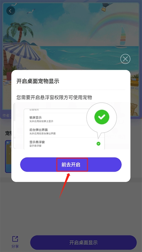 若想让宠物显示在桌面上,得先开启该App的“悬浮窗”权限。