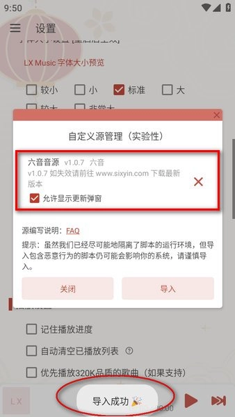 操作后会弹出“导入成功”的提示,同时界面上会出现一个名为“六音音源”的选项,之后点击“关闭”按钮即可。