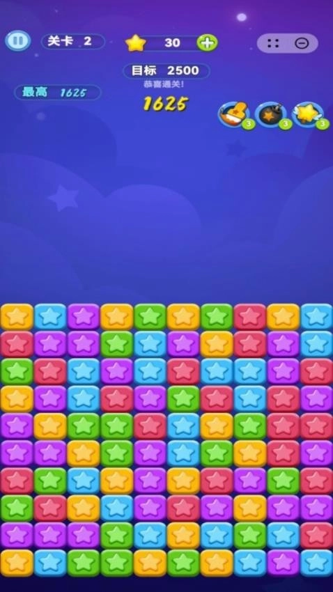采用经典的三消玩法规则,将三个相同的彩色星星连在一起就可以消除,注意星星位置的挪动就能解决各种复杂的关卡难题。