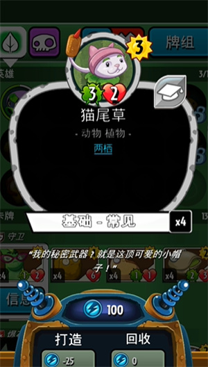 3、复制松果的作用就更简单了,玩家在使用了这张卡牌之后,可以将场上全部的植物都转化为复制松果。复制松果的生命值和攻击力都只有三点不是非常的厉害,但是在配合上前期健身菇召唤出来的蘑菇之后,复制松果的数量就非常可怕了。可以说复制松果是游戏后期玩家结束战斗的最好选择。