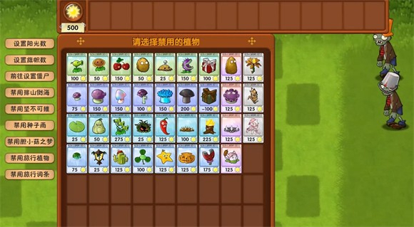 2、在关卡编辑器界面,左侧的按钮可以设置关卡里的各种参数,比如阳光数、僵尸旗帜数、出战的僵尸、禁用的植物等内容。