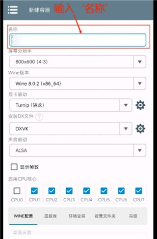 5、在新建容器界面向下滑动,下拉选择“设定显存大小”(若手机配置较低,建议将显存大小调小一些);