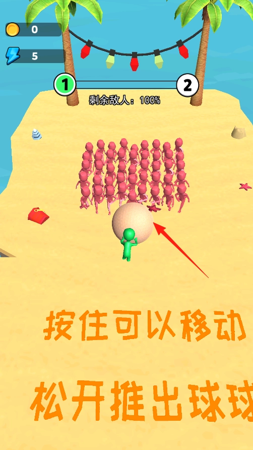 在正式关卡中,绿色小人会推着一颗球,前方有一群粉色敌人。你需要按住屏幕来移动小人调整位置,松开手指后小人就会把球朝着敌人推过去。通过用球撞击敌人来减少敌人数量,直到将这一波敌人全部清除完毕。
