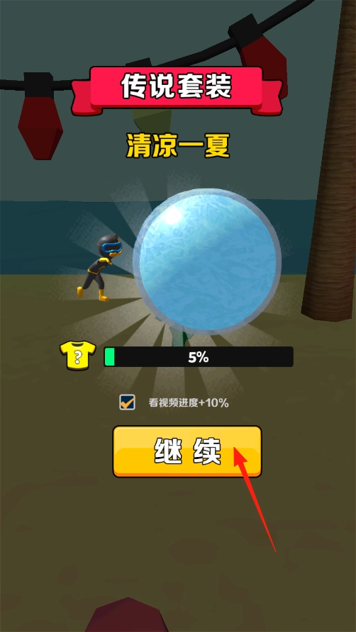 成功通关后,会弹出“清凉一夏”传说套装的奖励界面,在那里可以看到新皮肤和进度条。点击“继续”按钮后回到主界面,就能继续挑战下一关;也可以通过观看视频来加快皮肤进度,换上新套装后,小人会变得更炫酷。