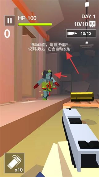 拖动画面调整准星对准僵尸,等它出现在视线里子弹就会自动发射,消灭僵尸能累积击杀数,还要留意生命值和剩余子弹量。