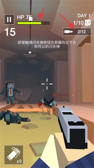 当遭遇僵尸围攻的危急时刻,你可以借助左下角的闪光弹道具,它能暂时击退或眩晕僵尸,从而为你创造出宝贵的生存空间。