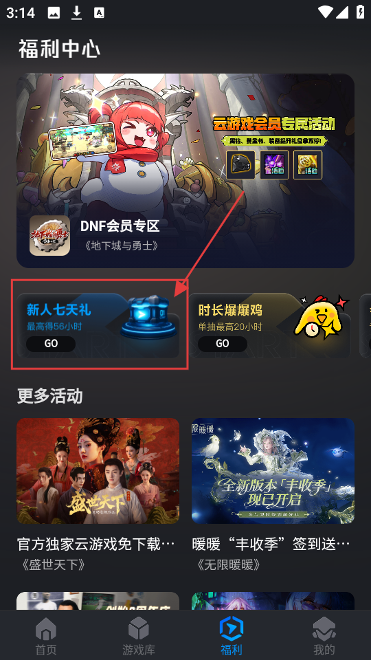 2、进入福利中心页面后,找到并点击【新人七天礼】选项,即可进入新人七天礼活动页面参与签到开宝箱。