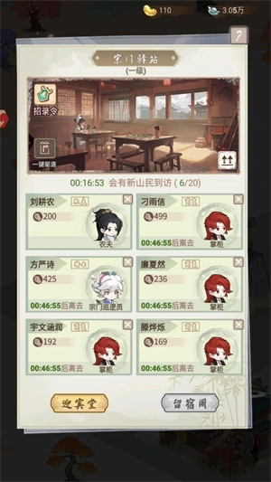 点击宗门驿站能够招募具有不同属性的弟子,而招募时需要先选择弟子的居所,他们才能正式加入宗门。