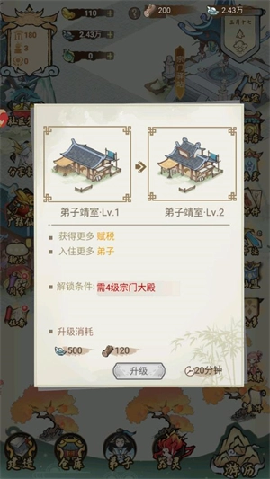 消耗银两与材料能够为建筑升级,持续提升宗门等级,以此打造出最出色的宗门。